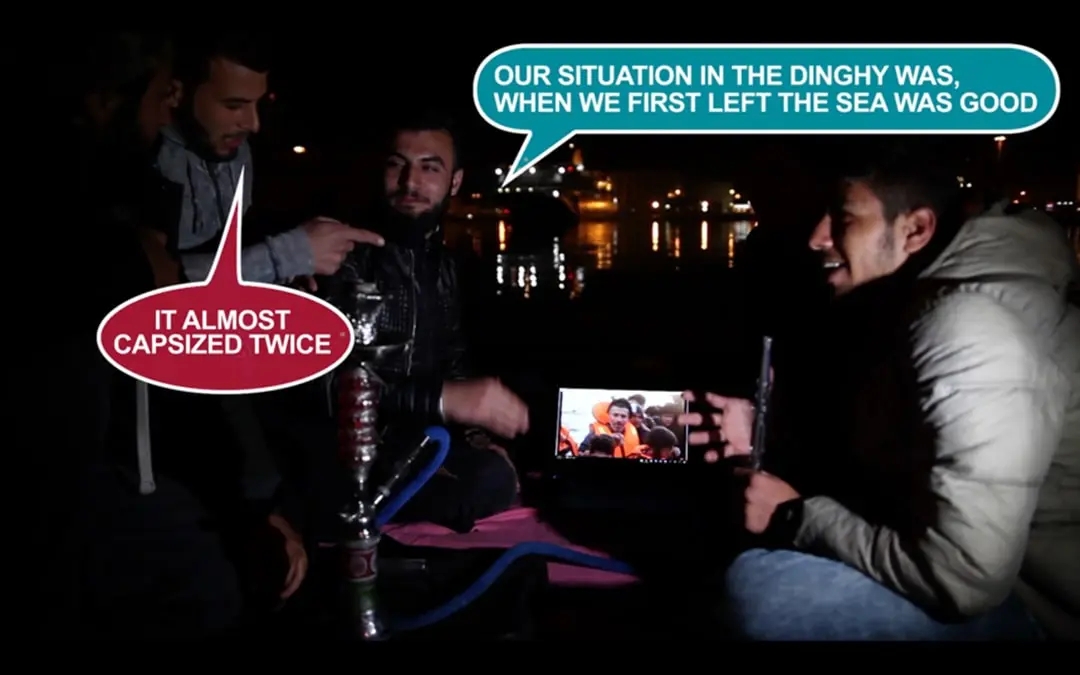 An exploration of refugee experience and of masculinity in a tableau single shot of an unfolding conversation. It is March 2016; the EU-Turkey deal has just come into effect and stopped all asylum seekers from passing through Greece to the rest of Europe. 50,000 people are stuck in Greece. A few thousand of them have made a makeshift camp at Piraeus Port in Athens. Five men, an Iranian and four Syrians, are sitting in Piraeus port sharing shisha and discussing the TV series ‘Vikings’ and their recent journey from Turkey to Lesbos by rubber dinghy.